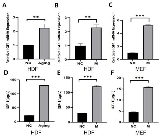 IGF-1 expression levels in normal and senescent cells. Note: NC represents the normal control group; Aging represents the replicative senescence group; and M represents the bleomycin-induced senescence group. (A–C), RT-qPCR was used to detect IGF-1 concentration in young and senescent cells. (D–F): an Enzyme-linked immunosorbent assay was used to measure the concentration of IGF-1 in young and senescent cells. ** p < 0.01, *** p < 0.001.