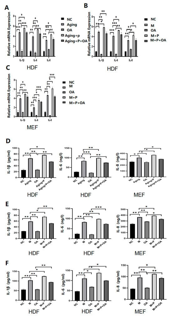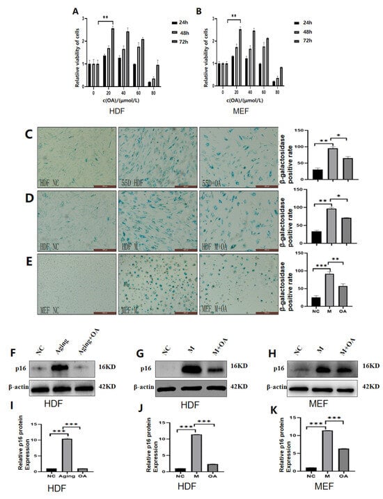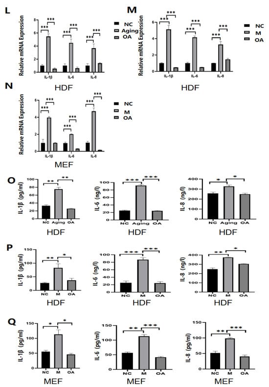 Cell viability, expression of P16, IL-1β, IL-6, and IL-8 in the cells of OA treatment. Note: NC represents the normal control group; Aging represents the replicative senescence group; OA represents the OA-treated group; and M represents the bleomycin-induced senescence group. (A,B) Plot of optimal concentration and time of OA on HDF cells and MEF cells, statistical results show the results of three repeated experiments. (C–E) plots of SA-β-Gal stained normal versus senescent cells and OA-treated cells, as well as statistical analysis, showing the results of triplicate experiments. (F–K) Western blot analysis and gray value analysis of senescence-related proteins P16 in normal cells, senescent cells, and OA-treated cells; the experiments were carried out in triplicate. (L–Q) RT-qPCR and ELISA experiments were used to detect the changes of senescence-related secretion factors of IL-1β, IL-6, and IL-8 in normal cells and senescent cells and after OA treatment, respectively. The experiments were conducted in triplicate. * p < 0.05, ** p < 0.01, *** p < 0.001.