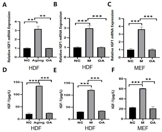 The expression of IGF-1 in senescent cells treated with OA etc. Note: NC represents the normal control group; Aging represents the replicative senescence group; OA represents the OA-treated group; and M represents the bleomycin-induced senescence group. (A–C) OA reduces IGF-1 expression in senescent cells. RT-qPCR was used to detect the changes of IGF-1 in senescent normal cells and after OA treatment. (D–F) ELISA was used to detect the changes of IGF-1 protein in normal cells after aging and OA treatment. All experiments were performed in triplicate.** p < 0.01, *** p < 0.001.