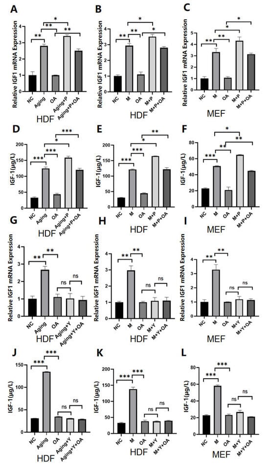 The IGF-1 expression in cells treated with OA. Note: NC represents the normal control group; M represents the bleomycin-induced senescence group; Aging represents the replicative senescence group; OA represents the OA-treated group; and P. Y represents the successful performance of the overexpression and inhibition of IGF-1. (A–C) The overexpression of IGF-1 was detected by RT-qPCR, and (D–F) the overexpression of IFG-1 was detected by ELISA. Successful inhibition of IGF-1 was detected by RT-qPCR assay in (G–I), and successful inhibition of IFG-1 was detected by ELISA assay in (J–L). The experiment was performed in triplicate. * p < 0.05, ** p < 0.01, *** p < 0.001.