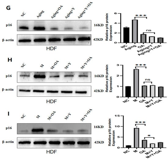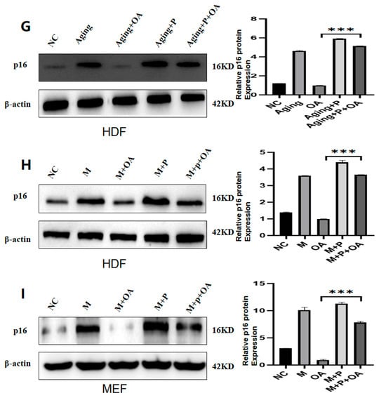 The expression of IL-1β, IL-6, IL-8, and P16 in HDF and MEF cells of different treatment groups. Note: NC represents the normal control group; M represents the bleomycin-induced senescence group; Aging represents the replicative senescence group; OA represents the OA-treated group; and p represents what happened after overexpression of IGF-1 and aging-related secretion factors of IL-1β, IL-6, and IL-8 were increased. The senescence-associated protein P16 was increased. (A–C) RT-qPCR was used to detect the changes of IL-1β, IL-6, and IL-8 after overexpression. (D–F) ELISA was used to detect the changes of IL-1β, IL-6, and IL-8 after overexpression. (G–I) detection of changes in P16 after overexpression, as well as gray value analysis. All experiments were performed in triplicate. * p < 0.05, ** p < 0.01, *** p < 0.001.