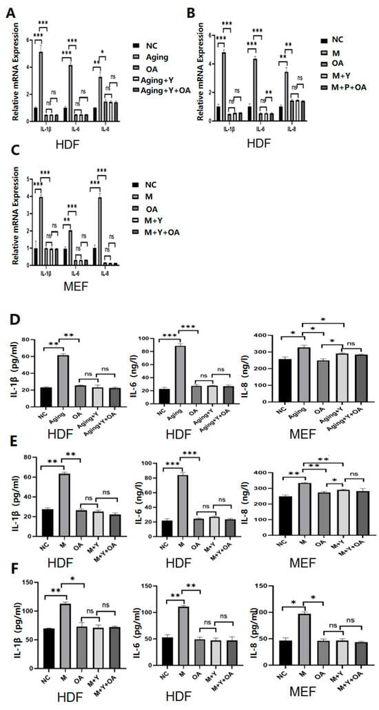 Because IGF-1 expression was increased in senescent cells per the results above, after OA treatment, the expression of GF-1 was detected by RT-qPCR (Figure 3A–C) and ELISA (Figure 3D–F), respectively. Our findings confirmed that IGF-1 expression was reduced by the addition of OA.