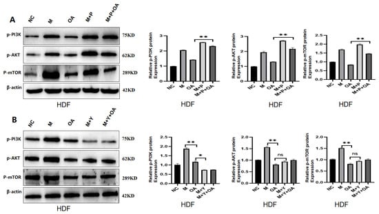 Phosphorylation levels of proteins in the PI3K/AKT/mTOR signaling pathway were altered by IGF-1 under both overexpression and inhibition conditions. Note: NC represents the normal control group; M represents the bleomycin-induced senescence group; Aging represents the replicative senescence group; OA represents the OA-treated group; and P.Y shows that the expression of the PI3K/AKT/mTOR signaling pathway was increased after IGF-1 overexpression compared with OA treatment alone. (A) Protein level changes in the PI3K/AKT/mTOR after IGF-1 overexpression, as well as gray value analysis. (B) Changes in the PI3K/AKT/mTOR protein levels after IGF-1 inhibition, as well as gray value analysis. All experiments were repeated 3 times. * p < 0.05, ** p < 0.01.