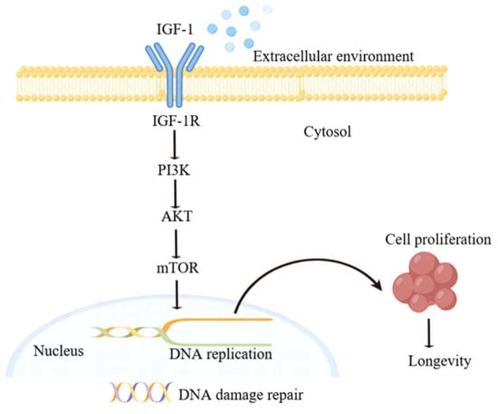 Schematic drawing of the regulatory mechanism of IGF-1 on cell aging. Insulin-like growth factor 1 (IGF-1); Insulin-like growth factor 1 receptor (IGF-1R); Phosphatidylinositol 3-kinase (PI3K); Protein Kinase B (AKT) mammalian target of rapamycin (mTOR).