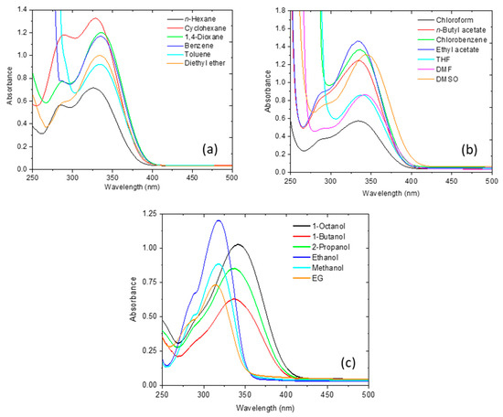 UV-vis absorption spectra of ANHMA in non-polar (a), polar–aprotic (b), and polar–protic (c) solvents. THF: Tetrahydrofuran, DMF: N,N-Dimethylformamide, DMSO: Dimethyl sulfoxide, EG: Ethylene glycol.