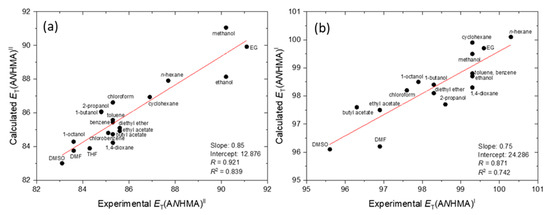Figure 3 shows plots of the ET(ANHMA) values calculated from the developed Catalán models vs. experimental values, which highlight the fairly good general predictive ability of the models but also show that specific solute–solvent interactions are also relevant for several of the solvents, which limit in some extent the goodness of the fits, as revealed by the R2 values of the fittings, in particular for band I whose maximum of absorption varies the least.