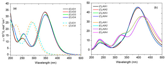 TD-DFT(B3LYP)/6-311++G(d,p) calculated UV-vis absorbance spectra of relevant ANHMA isomeric forms (gas phase): (E)- and (Z)-enol–imine lowest energy conformers (a), and (Z)- and (E)-keto–amine C–N trans conformers (b).