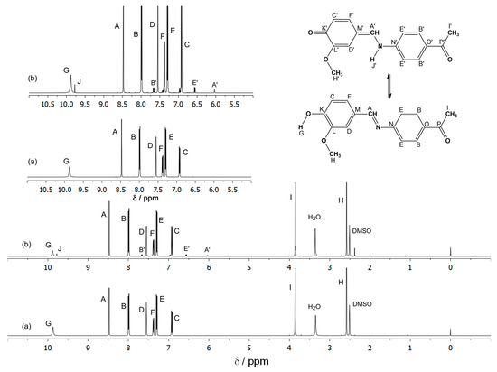 1H NMR spectra of ANHMA in DMSO-d6 obtained (a) immediately and (b) one week after the dissolution; one inset containing the expansion from 5.00 to 11.00 pm for better visualization of the proton signals for the predominant form of ANHMA (the enol-imine tautomer) (92%) and the minor signals assigned to an additional species (the keto-amine tautomer) (8%), in a slow exchange equilibrium, in the NMR time scale. The signals at 3.36 and 2.51 ppm are assigned to traces of H2O and DMSO, respectively.