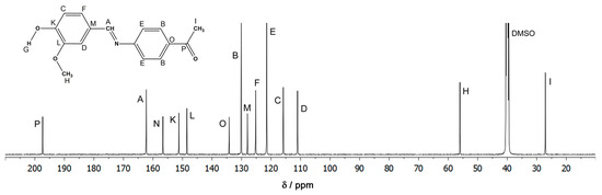 Figure 5 and Figure 6 show the 1H and 13C NMR spectra of ANHMA in DMSO-d6 solution. The correspondent bidimensional spectra are shown in Figures S7–S10, and the 1H and 13C NMR chemical shifts are presented in Table 3 and Table 4, respectively, where they are compared with theoretically predicted values calculated at the GIAO/DFT(B3LYP)/6-311++G** level (where GIAO refers to the Gauge-Independent Atomic Orbital method [50,51]).