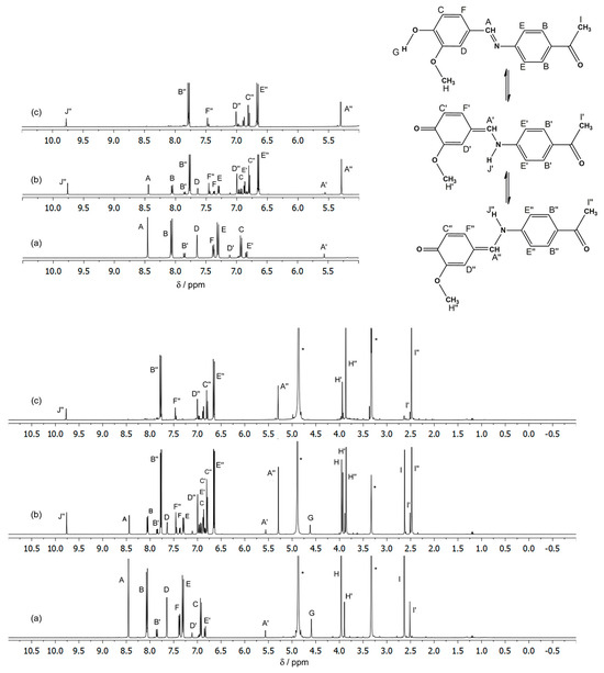 DMSO, methanol, and chloroform were chosen for a detailed investigation of the tautomerism of ANHMA in solution as representative solvents. DMSO was chosen because of its unique characteristics within the context of the present study (it is the solvent for which the observed reversal in solvatochromism takes place; see Section 2.1 and Section 2.2), and methanol as a typical polar–protic solvent. The reason for choosing also chloroform will become clear later on, but it was essentially motivated by the fact that this solvent was the one where the studied compound was found to be photochemically less stable (Section 2.5).