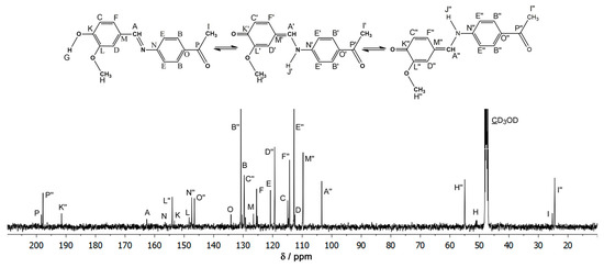Figure 7 and Figure 8 show the 1H and 13C NMR spectra of ANHMA in a methanol-d4 solution. The correspondent bidimensional spectra are shown in Figures S11–S14. The 1H and 13C NMR chemical shifts are given in Table 3 and Table 4.