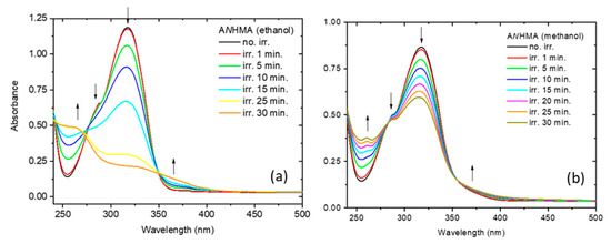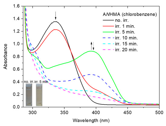 UV (λ ≥ 311 nm) irradiation of ANHMA (for a maximum of 30 min) in all studied solvents was undertaken. Significant changes in the compound’s UV-vis absorbance spectrum were only observed for solutions of the compound in chlorobenzene and chloroform (both chlorinated polar–aprotic solvents) and to a lesser extent in n-butyl acetate (polar–aprotic), and 2-propanol, 1-butanol, ethanol, and methanol (polar–protic). The results obtained in chlorobenzene and chloroform solutions were distinct because these were the only cases where the solution considerably changed its visual appearance. Being initially colorless and transparent, the solution quickly turned to light yellow (in the first case) or became translucent (chloroform). All other solutions are colorless and transparent after exposure to irradiation.