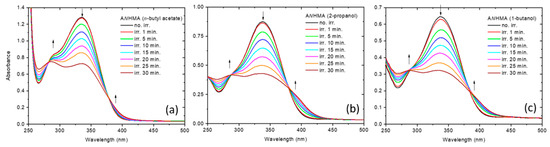 Absorbance spectrum of ANHMA in n-butyl acetate (a), 2-propanol (b), and 1-butanol (c) solutions as a function of time of UV irradiation (λ ≥ 311 nm).