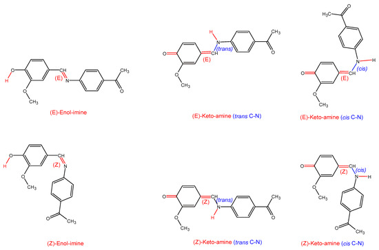 ANHMA has four major basic isomeric forms, which are depicted schematically in Scheme 1: two enol-imine forms with (E) and (Z) configuration about the imine C=N bond, and two keto-amine forms with (E) and (Z) arrangements around the exocyclic C=C bond. All these species have several conformers that result from the different possible orientations of the OH, OCH3, C(=O)CH3 substituents and of the whole hydroxy-methoxyphenyl and acetylphenyl fragments, in the case of the enol-imine forms, and from the different orientations of the OCH3 and C(=O)CH3 substituents and of the whole acetylphenyl and acetylanilino fragments, in the case of the keto-amine forms. The DFT(B3LYP)/6-311++G(d,p) structures of the conformers of the different forms are provided in the Supporting Information Figures S1–S4 and their relative energies (in the gas phase) are given in Table S1.