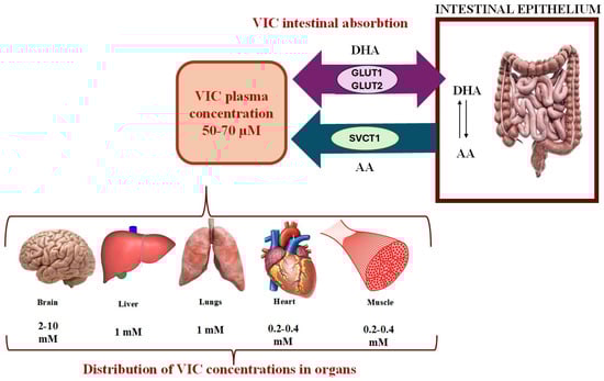 Absorption of VIC (Figure 2) occurs mainly in the intestine, specifically in the distal ileum, via sodium-dependent transporters (SVCT1 and SVCT2). This process is saturable and dependent on intestinal pH and represents the decrease in absorption capacity at high concentrations of VIC. At low doses, VIC is absorbed in a high proportion. VIC can also be absorbed by passive diffusion, especially at low pH, where VIC is non-ionized. In the small intestine, VIC exists as ascorbate (predominant) and DHA, which is reduced to the ascorbate form in cells. DHA is absorbed through glucose transporters (GLUT1 and GLUT2) [24,63,64].