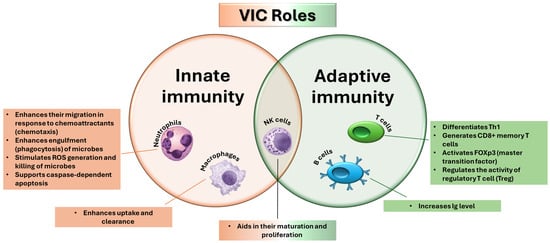 Schematic representation of VIC roles in innate and adaptive immunity. Created based on information from [121,122,123].
