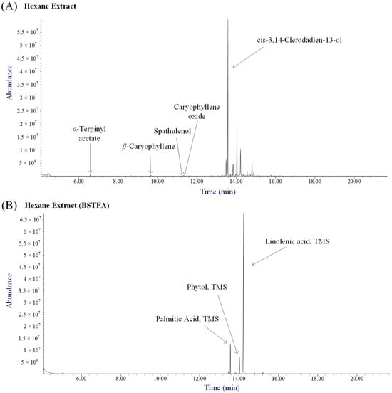 Based on the NMR spectrum, the compounds present in the n-hexane extract may exhibit a range of polarities and physicochemical properties. For this reason, the sample was analyzed both directly via GC-MS, and after derivatization with N,O-bis(trimethylsilyl)trifluoroacetamide (BSTFA) to enhance volatility and improve detection of specific analytes. As shown in Figure 1A, the volatile fraction of the n-hexane extract includes five compounds belonging to the terpenoid class that have been previously reported as components of aerial part extracts of V. agnus-castus [19,20]. Figure 1B presents the total ion chromatogram of the n-hexane extract, which was trimethylsilylated prior to injection into GC-MS. Two fatty acids (i.e., palmitic and linolenic acids) were identified along with phytol.