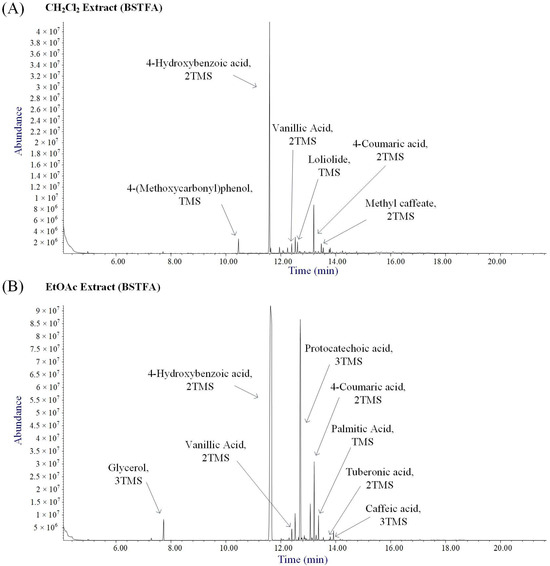 The GC-MS analysis of the CH2Cl2 (Figure 2A) and EtOAc (Figure 2B) extracts, conducted after derivatization with BSTFA, revealed the presence of several phenolic compounds, including 4-hydroxybenzoic acid, protocatechuic acid, vanillic acid, and caffeic acid. These findings confirm that the leaves of V. agnus-castus are a rich source of phenolic compounds and their derivatives, which may exhibit a broad spectrum of biological activities [21,22].