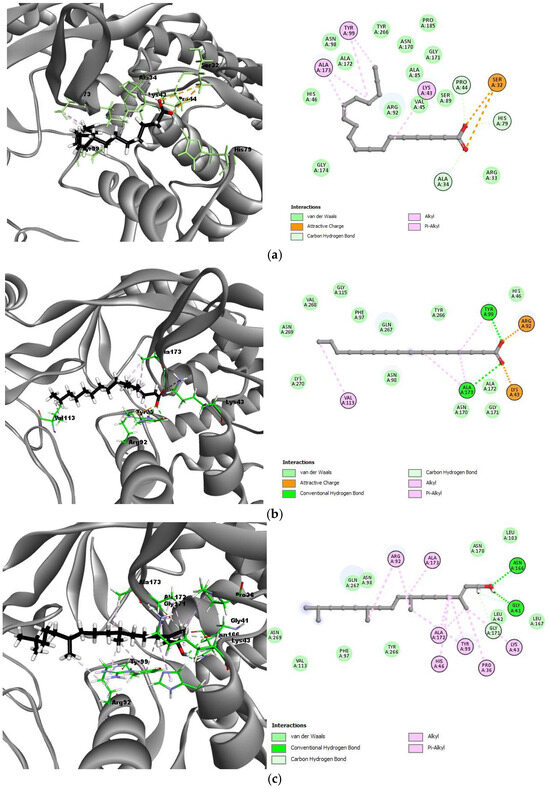 3D and 2D interactions between the best-docked compounds and DNA gyrase of E. coli (3G7E). (a) 3G7E–Linolenic acid; (b) 3G7E–Palmitic acid; (c) 3G7E–Phytol.