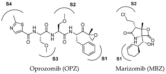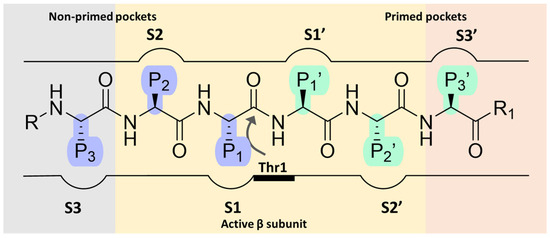 Over the past two decades, extensive efforts have been made to search for proteasome inhibitors that could serve both as molecular probes to investigate proteasome biology and as potential therapeutic agents for treating various pathological conditions, including cancer. The fulcrum of proteasome inhibition is represented by the substrate-binding channel with its relative pockets (S pockets) as well as the N-terminal threonine residues (Thr1s) in the active site. Specifically, as a member of the endo-protease family, the substrate-binding channel consists of primed and non-primed specificity pockets (S pockets) that bind polypeptides in the C-to-N-terminal direction. Most of the known proteasome inhibitors are peptide-like derivatives with side chains (P sites) opportunely selected to gain selectivity by fitting into the corresponding S pockets (Figure 2).
