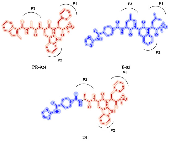 Chemical structures of immunoproteasome inhibitors PR-924 and E-83 and the corresponding hybrid compound 23 [52].