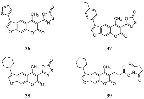 In this work, Schriffrer et al. synthesized a new series of psolaren derivatives, retaining the oxathiazolone at position 3 while introducing some different substituents at position 4′, to assess their effects on activity and selectivity. PS3 was modified at position 3 to evaluate the impact of different electrophilic warheads. At position 4′, they introduced variously substituted phenyl rings (in ortho, meta and para positions), bioisosteres and cycloalkyl rings. All compounds were tested in fluorimetric assays using succinyl-Leu-Leu-Val-Tyr-AMC as the fluorogenic substrate, exhibiting submicromolar activity against the β5i subunit. The most active compounds included those bearing a thiophene (36), a para ethyl phenyl (37) and a cyclohexyl (38) at position 4′, with β5i IC50 values of 141 nM, 174 nM and 106 nM, respectively (Figure 13). Regarding derivatives bearing substituents in the para position, the presence of bromine or fluorine led to a reduced activity, as did the introduction of ortho- or meta-methoxy or meta-methyl groups. However, activity improved with the introduction of larger cycloalkyl groups, as observed for compound 38.