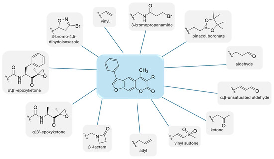 - Schiffrer, E.S.; Proj, M.; Gobec, M.; Rejc, L.; Šterman, A.; Mravljak, J.; Gobec, S.; Sosič, I. Synthesis and Biochemical Evaluation of Warhead-Decorated Psoralens as (Immuno)Proteasome Inhibitors. Molecules 2021, 26, 356. [Google Scholar] [CrossRef] [PubMed]