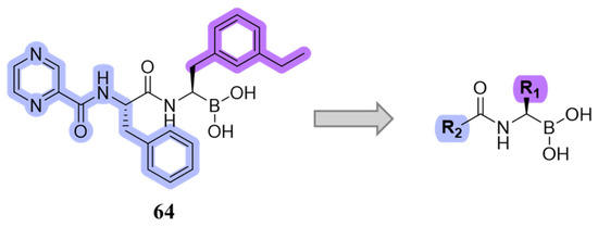 In a second compound series, the authors introduced bicyclic aromatic systems to improve selectivity, obtaining the 3-benzo-furanyl derivative 68, which was approximately 10-fold more potent than the previously synthesized derivatives (65–67) (IC50 = 2.1 ± 1.0 nM), while also enhancing selectivity. Compound 68 exhibited a good pharmacokinetic profile and stability in mouse and human liver microsomes. Clearence, volume of distribution and half-life time were also evaluated, yielding good results. Although benzofuran is known for its metabolic instability [63], the presence of the polar boronic acid group preserved it from oxidative metabolism. Small substituents at positions 2, 6 and 7 were introduced on the benzofuran ring to assess their influence on activity and selectivity. Compound 69, bearing a methyl group on the benzofuran ring, was the most promising in terms of its selectivity with a β5c/β5i ratio of 2334.