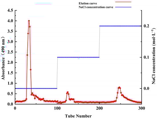 ACP-60 was purified using a DEAE-52 cellulose column. The mobile phase consisted of 0, 0.1, and 0.2 mol/L NaCl, which were used sequentially to elute the sample at a flow rate of 1 mL/min. The phenol–sulfuric acid method was employed to determine the polysaccharide content and construct the elution curve. Following freeze-drying, three purified polysaccharide fractions (ACP-60-A, ACP-60-B, ACP-60-C) were obtained [31].