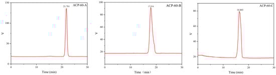 As shown in Figure 1, ACP-60 was purified using the DEAE-52 column, yielding three sub-fractions (ACP-60-A, ACP-60-B, and ACP-60-C). The three homogeneous polysaccharides obtained were ACP-60-A (50.76 ± 1.21%, wt%), ACP-60-B (2.58 ± 0.83%, wt%), and ACP-60-C (5.40 ± 1.09%, wt%). These polysaccharides exhibited a single, symmetrical peak, as shown in Figure 2. The elution times for ACP-60-A, ACP-60-B, and ACP-60-C were approximately 21.781, 17.916, and 16.603 min, respectively. Based on the standard dextran calibration curve (log Mw = −0.2075x + 8.4826, R2 = 0.9903), the average molecular weights of ACP-60-A, ACP-60-B, and ACP-60-C were calculated to be 9.18 kDa, 58.21 kDa, and 109.01 kDa, respectively. The monosaccharide composition analysis of ACP-60-A, ACP-60-B, and ACP-60-C is shown in Figure 3. Comparison of the retention times with mixed monosaccharide standards revealed that ACP-60-A is primarily composed of Glc and Fru, ACP-60-B contains Rha, Gal, Fru, and Man, and ACP-60-C is composed of Man, Rha, Gal, and Xyl. The monosaccharide composition and molarity of ACP-60-A, ACP-60-B, and ACP-60-C are detailed in Table 2.