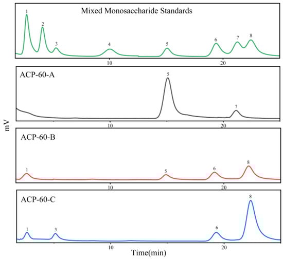 Monosaccharide composition analysis of ACP-60-A, ACP-60-B, and ACP-60-C.