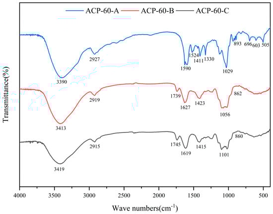 FT-IR spectra of the polysaccharide fractions ACP-60-A, ACP-60-B, and ACP-60-C.