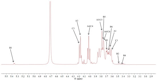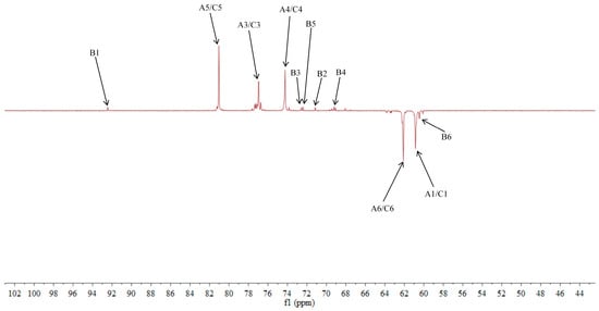 The δC 92.46 and δH 5.36 ppm signals are characteristic of the end-group carbon-hydrogen signal of α-Glcp-(1→, and further analysis of H2-H5 using 1H-1H COSY provided chemical shift values of 3.45, 3.68, 3.39, and 3.76, respectively [28]. The HMBC spectra revealed that H4 correlated with C 72.58, 71.16, and 60.45, with δC 60.45 being identified as the C6 signal of α-Glcp-(1→. δC 103.21 represents the typical end-group C2 signal of →1)-β-Fruf-(2→, while δC 103.67 corresponds to the end-group C2 signal of β-Fruf-(2→ In the DEPT-135 spectrum, δC 60.87 is attributed to –CH2, which forms a -CH2O-group with δH 3.85 and 3.62, and the HMBC spectrum showed that δH 3.85 correlated with δC 103.21, 103.67, and 76.97, establishing that δC 60.87 is a C1 signal and δC 76.97 is a C3 signal. The 1H-1H COSY spectrum showed that H3 (δH 4.18) correlated with δH 4.02, indicating that δH 4.02 is the H4 signal. H4, in turn, correlated with δH 3.77, identifying δH 3.77 as the H5 signal. The HMBC spectrum analysis of H4 and C 62.11 confirmed that C 62.11 corresponds to the C6 signal [29].
