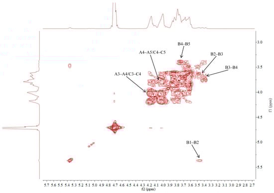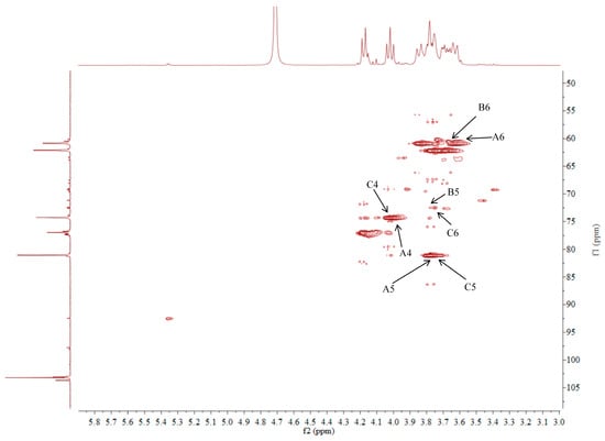 The 1H NMR spectrum of ACP-60-A displayed an anomeric proton signal at low-field δH 5.36. Based on the analysis of the monosaccharide composition and methylation results, δH 5.36 was presumed to correspond to the end-group hydrogen signal of α-Glcp-(1→, with the remaining signals appearing primarily in the range δH 3.61–4.19. The 13C NMR spectra revealed that δC 103.2 was a heterocapitate carbon signal, and δC 60.4–81.1 corresponded to glycocyclic carbon signals linked to oxygen [27]. Hydrocarbon signals from the sugar residues were attributed to each sugar component by analyzing the 1H NMR, 13C NMR, DEPT-135, 1H-1H COSY, HSQC, HMBC, and NOESY spectra, as summarized in Figure 5, Figure 6, Figure 7, Figure 8, Figure 9 and Figure 10 and Table 4.