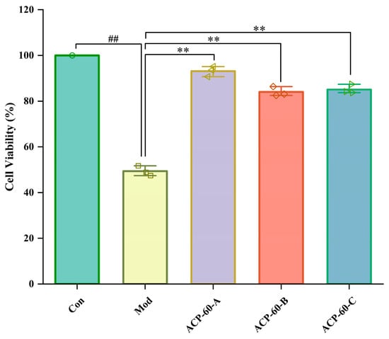 Effects of ACP-60-A, ACP-60-B, and ACP-60-C on the survival rate of HK-2 cells. ( ± s; n = 3) ## p < 0.01 vs. the Con group, ** p < 0.01 vs. the Mod group.