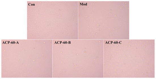 The Con group exhibited healthy cells, which were well-aligned and orderly, as shown in Figure 12. After 36 h of UA stimulation, HK-2 cells became elongated, deformed, and disorganized, with noticeable fibrosis. Following treatment with ACP-60-A, ACP-60-B, and ACP-60-C, the cell morphology of each group improved, with an increased number of adherent cells. Some cells regained a more normal shape and were more orderly arranged, and fibrosis was significantly reduced. These results suggest that ACP-60-A, ACP-60-B, and ACP-60-C significantly improved the HK-2 cell morphology, with ACP-60-A showing the highest efficacy.