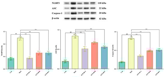 Expression of NLRP3, ASC, and Caspaes-1 proteins in renal tissue. ( ± s; n = 3) ## p < 0.01 vs. the Con group, * p < 0.05, ** p < 0.01 vs. the Mod group.