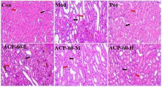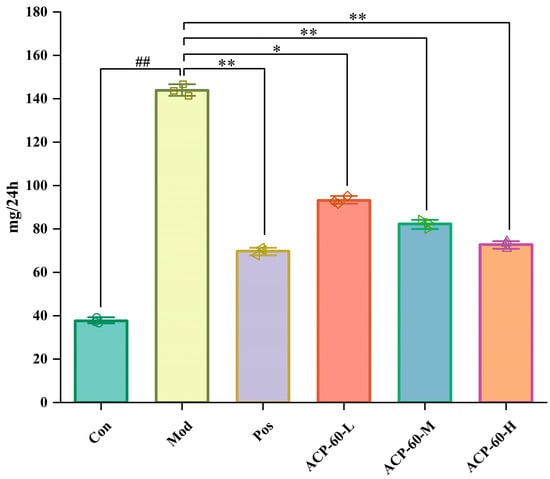 Urinary protein serves as an important biomarker for kidney disease diagnosis and treatment. In the current study, the 24-h urinary protein levels in the Mod group were significantly elevated compared to the Con group (p < 0.01), confirming the successful establishment of the GN model. In comparison with the Mod group, the Pos group and the medium- and high-dose ACP-60 groups (ACP-60-M and ACP-60-H) showed a highly significant reduction in urinary protein levels (p < 0.01), while the low-dose ACP-60 group (ACP-60-L) demonstrated a significant decrease (p < 0.05) (Figure 14). These findings suggest a dose-dependent effect of ACP-60 on reducing urinary protein excretion. Notably, the high-dose ACP-60 (ACP-60-H) was particularly effective, indicating its potential to protect kidney function and delay the progression of kidney disease.