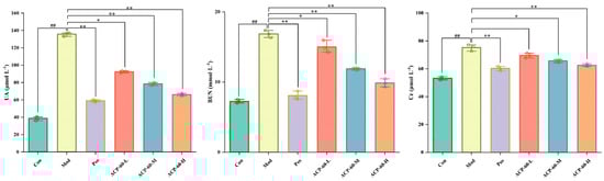 The serum levels of UA, Cr, and BUN were significantly elevated in the Mod group compared to the Con group (p < 0.01), as shown in Figure 15. Treatment with allopurinol (Pos group) and medium- and high-dose ACP-60 (ACP-60-M and ACP-60-H groups) resulted in significant or highly significant reductions in these parameters (p < 0.05 or p < 0.01). The low-dose ACP-60 group (ACP-60-L) exhibited a significant trend of reduction in UA, Cr, and BUN levels, although some changes were not statistically significant (p < 0.05). The observed effects were dose-dependent, with the high-dose ACP-60 (ACP-60-H) showing the most pronounced improvement in renal function. UA, Cr, and BUN are critical biomarkers for assessing kidney function, and the reductions observed following ACP-60 treatment indicate its potential efficacy in improving renal health and mitigating kidney damage.