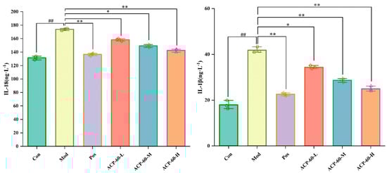 Effect of ACP-60-L, M, H on IL-18, IL-1β content of GN rats. ( ± s; n = 3) ## p < 0.01 vs. the Con group, * p < 0.05, ** p < 0.01 vs. the Mod group.