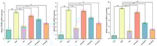 In comparison to the Con group, the mRNA expression levels of NLRP3, ASC, and Caspase-1 in the renal tissue of the Mod group were significantly elevated (p < 0.01), as shown in Figure 19. Treatment with allopurinol (Pos group) and high-dose ACP-60 (ACP-60-H) resulted in a highly significant reduction in the expression of these mRNAs (p < 0.01) compared to the Mod group. Moderate-dose ACP-60 (ACP-60-M) significantly decreased the mRNA expression of NLRP3 and Caspase-1 (p < 0.01), while ASC mRNA levels were significantly reduced (p < 0.05). In the low-dose ACP-60 group (ACP-60-L), the mRNA expression of NLRP3 and Caspase-1 was significantly reduced (p < 0.05), while ASC mRNA expression showed a decreasing trend but did not reach statistical significance. These findings demonstrate that ACP-60-H has the strongest inhibitory effect on the mRNA expression of NLRP3, ASC, and Caspase-1.