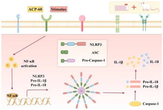 IL-1β, a key inflammatory mediator in GN, is predominantly produced via the NLRP3 inflammasome signaling pathway. Activation of NLRP3 leads to the activation of Caspase-1, which converts Pro-IL-1β into its mature form, IL-1β, subsequently released into the extracellular environment. In this study, ACP-60 demonstrated the ability to reduce the inflammatory cytokines IL-18 and IL-1β. Experimental findings revealed that ACP-60 not only downregulated the expression of NLRP3, ASC and Caspase-1 proteins but also inhibited their mRNA expression levels.