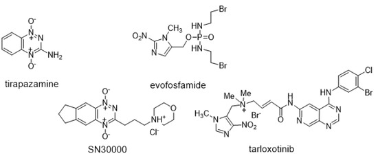 Dysfunctional vasculature, deregulated cellular metabolism, and the tolerance of low oxygen conditions generate hypoxia in neoplastic tumors [1]. Hypoxia contributes to a poor prognosis across multiple primary tumor sites [2] and also increases resistance to radiotherapy, chemotherapy, and immune-suppressing therapy treatment regimens [3,4,5]. Hypoxia assists disease progression, as outgrowing clones are resistant to apoptosis [6]. This enhances tumor angiogenesis [7], drives the epithelial-to-mesenchymal transition [8], and thus enhances invasion and metastasis [9]. While multiple clinical radiotherapy trials have attempted to harness hypoxic cell radiosensitizers to increase the killing of hypoxic tumor cells, these have shown only a modest benefit [10] and consequently have driven the search for alternative drug-based strategies. Hypoxia-selective bioreductive prodrugs that release potent cytotoxins have been shown in a theoretical study to improve the killing of hypoxic cells over that of radiosensitizers [11]. One such group of prodrugs, shown in Figure 1, utilize one-electron reduction via cellular reductases to release anticancer effectors: evofosfamide, giving rise to DNA cross-links, and the benzotrazine compounds tirapazamine and SN30000, forming cytotoxic radicals or tarloxotinib releasing a kinase inhibitor upon fragmentation of their radical anions [12,13]. Yet, clinical trials either combining the prodrugs with standard anticancer therapies (e.g., tirapazamine with radiotherapy [14] and evofosfamide with doxorubicin [15,16]), and trials with tarloxotinib alone [17,18]), still failed to improve outcomes for patients. However, some single-agent activity for tarloxotinib against the HER2 cohort in a subsequent trial has been seen [19], and evofosfamide combined with gemcitabine in a Phase III pancreatic cancer trial narrowly failed to reach significance [20].