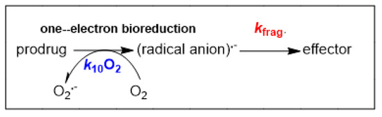 The cytotoxicities of the above bioreductive prodrugs are inhibited under aerobic conditions (21% O2) and assumed to be mainly so under normoxia [13] (ca. average of 6.1% O2 in peripheral tissues) [21], with the drugs becoming highly cytotoxic in low levels of oxygen (ca. 0.02- 1% O2). The concentration of oxygen ([O2]) that halves the cytotoxicity level of the prodrugs seen in anoxia, known as the K-value, ([O2]K), varies widely from tirapazamine and its related analog SN30000 at 1.21 μM and 1.14 μM [O2]K, respectively [22,23], to evofosfamide at 0.27 μM [O2]K [24] and 0.034 μM [O2]K for tarloxotinib [25]. It is generally thought that the concentration levels of oxygen found in normal tissues suppress the release of the effectors from the radical anions via back-oxidation through an electron transfer to O2 [13]. In kinetic terms, the pseudo-first-order rate-constant derived from k10O2/M−1 s−1 and multiplied by the K-value [O2]K /M competes with the first-order release of the effectors via fragmentation, kfrag./s−1 (Figure 2).