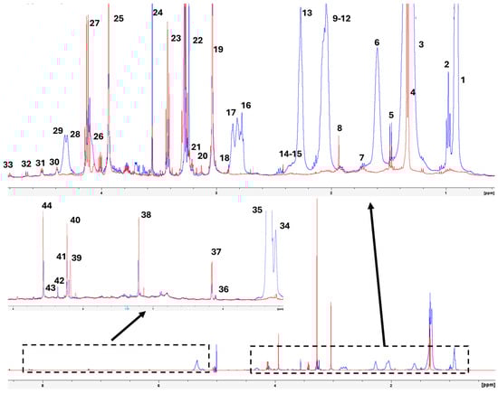 Representative 1D 1H-HRMAS NMR spectrum of muscle tissue from wild gilthead seabream (red line) and farmed gilthead seabream (blue line). The spectra correspond to the initial samples. The boxes present the regions of the spectra that are magnified to see them more clearly. The assignation of the peak indicated by a number is shown in Table 1.