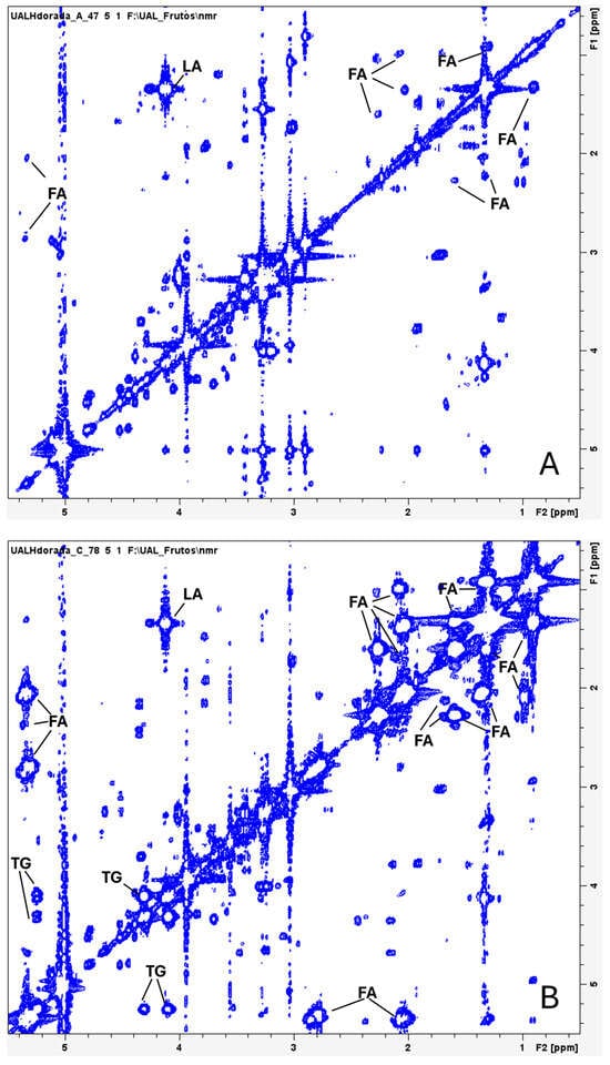 Water-suppressed 1H,1H-COSY HRMAS spectra of muscle tissue from wild gilthead seabream (A) and farmed gilthead seabream (B). The spectra correspond to the initial samples. Fatty acids (FAs), triglycerides (TGs) and lactate (LA) are indicated in the spectra.