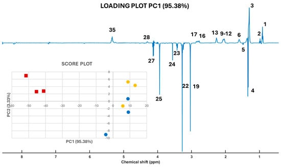 Loadings plot of the 1D pseudo-spectra of PC1 and scores (insert) plots for robPCA of 1D 1H-HRMAS NMR spectra of muscle tissue from wild gilthead seabream (red squares) and farmed gilthead seabream (blue circles from Spain and orange circles from Greece). The assignation of the peak indicated by a number is shown in Table 1.