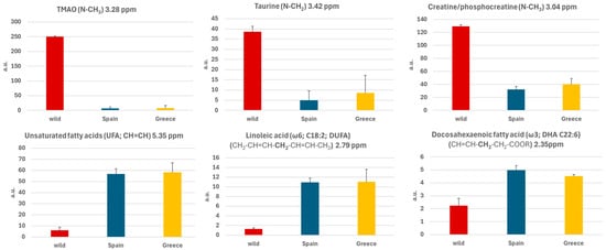 Histograms of the mean values of the integral of the area under the signal of the selected metabolites (TMAO, taurine and creatine/phosphocreatine) and lipids (unsatured fatty acids, linoleic acid and docosahexaenoic acid) and standard errors obtained for samples from wild gilthead seabream and farmed gilthead seabream (from Spain and from Greece).