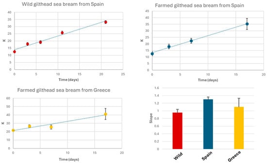 Initial K-values were 12.5% for wild seabream, 12.6% for seabream farmed in Spain, and 21.7% for seabream farmed in Greece. The slope values for K-value increase were 0.95, 1.30, and 1.10 for wild gilthead seabream, farmed seabream from Spain, and farmed seabream from Greece, respectively (Figure 6). The R2 values of the linear regressions for K-value variations were 0.98, 0.99, and 0.92 for wild seabream, Spanish farmed seabream, and Greek farmed seabream, respectively. These values were comparable to those reported in other studies, despite differences in fish species or analytical techniques [7]. The main distinction lies in the slope values, which, in our case, were slightly lower than those reported by other authors [7].
