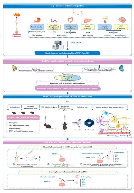 In summary, we established a comprehensive sequential metabolism approach to elucidate the dynamic biotransformation of PMFs in CRP and to further analyze the components that enter the brain. Subsequently, network pharmacology was employed to predict the potential pharmacological and molecular mechanisms of PMFs, which were then validated in animal and cell models. Finally, an in vitro screening assay was conducted to screen neuroinflammatory inhibitors from PMFs. This study was designed to provide a detailed chemical and metabolic profile, elucidating the potential bioactive ingredients of PMFs for the amelioration of CNS diseases. Additionally, it sought to delineate the role of PMFs in mitigating CNS disorders via anti-inflammatory pathways and to pinpoint potential neuroinflammatory inhibitors, providing a preliminary research foundation for the development of PMFs as therapeutic agents or dietary supplements. Furthermore, this integrated strategy could effectively be extended to elucidate the efficacy of herbs or functional foods and to screen for active components that ameliorate CNS disorders. The flowchart of our study is illustrated in Figure 1.